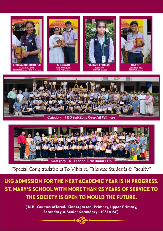 RANGOTSAV: In the All Kerala ICSE/ISC Cultural fest- Rangotsav which was held at K.E. School, Maannaanam, Kottayam, out of 73 schools participated, St.Mary’s English Medium School, Chevarambalam secured seventh position. Most of our students got A-grades.